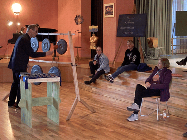 Im Zentrum steht die Arbeit mit den Metallinstrumenten Tam Tam, Becken, Klangröhren, Gongs, Xylophon, Klangstäbe und Zimbeln. Die Metallklänge führen in die Stille. Sie verbinden Himmel und Erde. Wir stehen als Spielende, Lauschende in der Mitte und sind unmittelbar berührt.